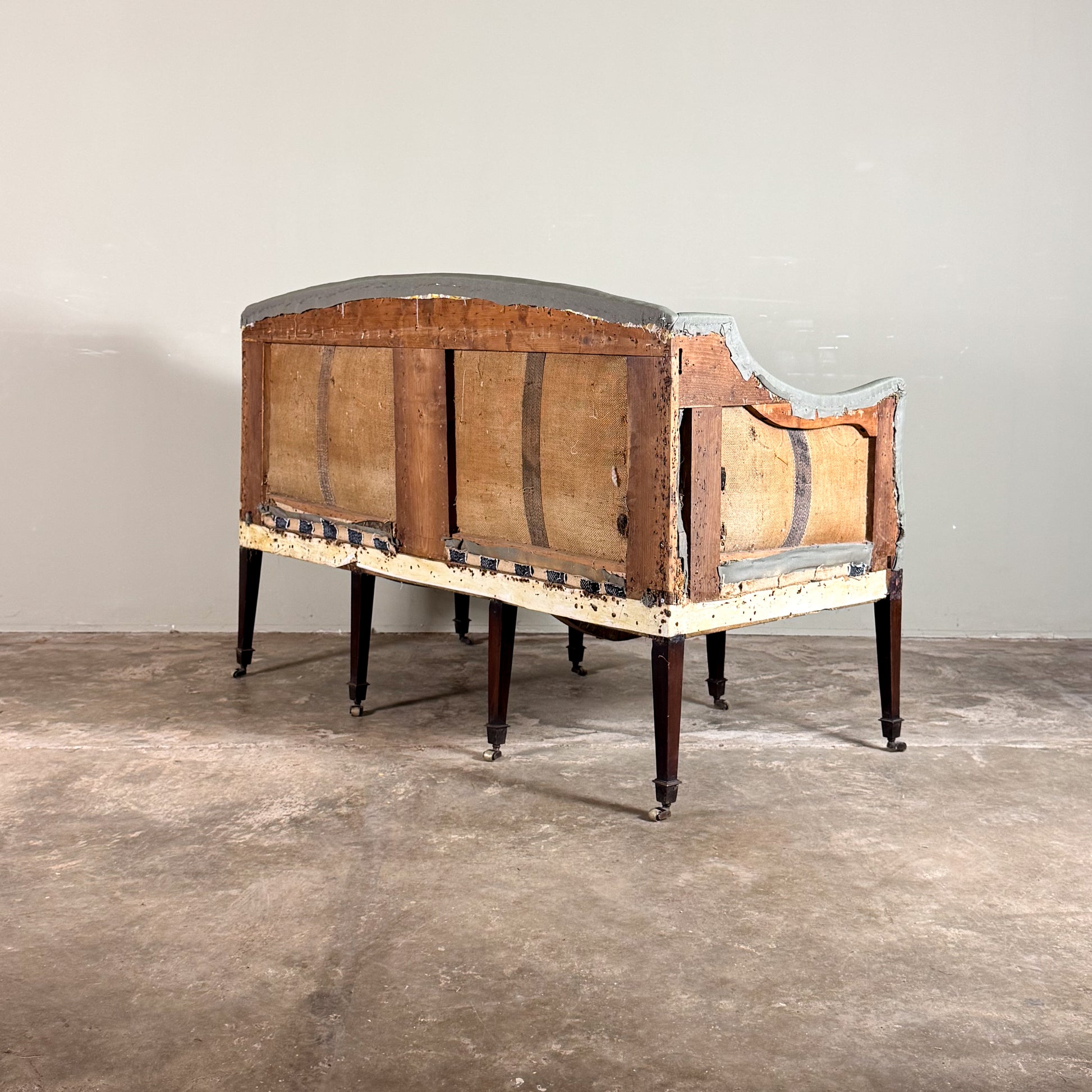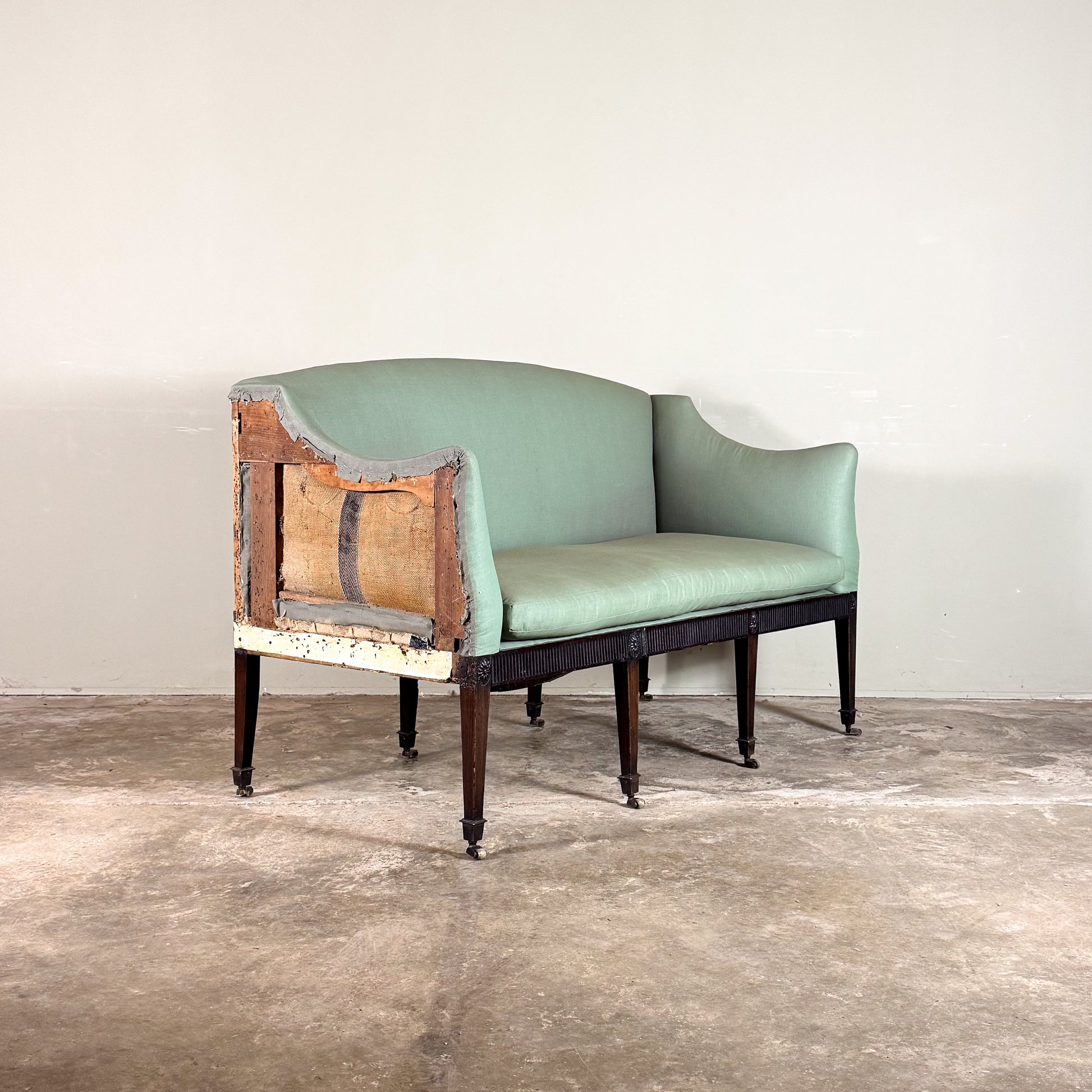 Extremely good quality Georgian two seater sofa, standing on eight square taper legs, with original brass cup castors. Fluted decoration to the front edge and delicate carved foliate paterae.