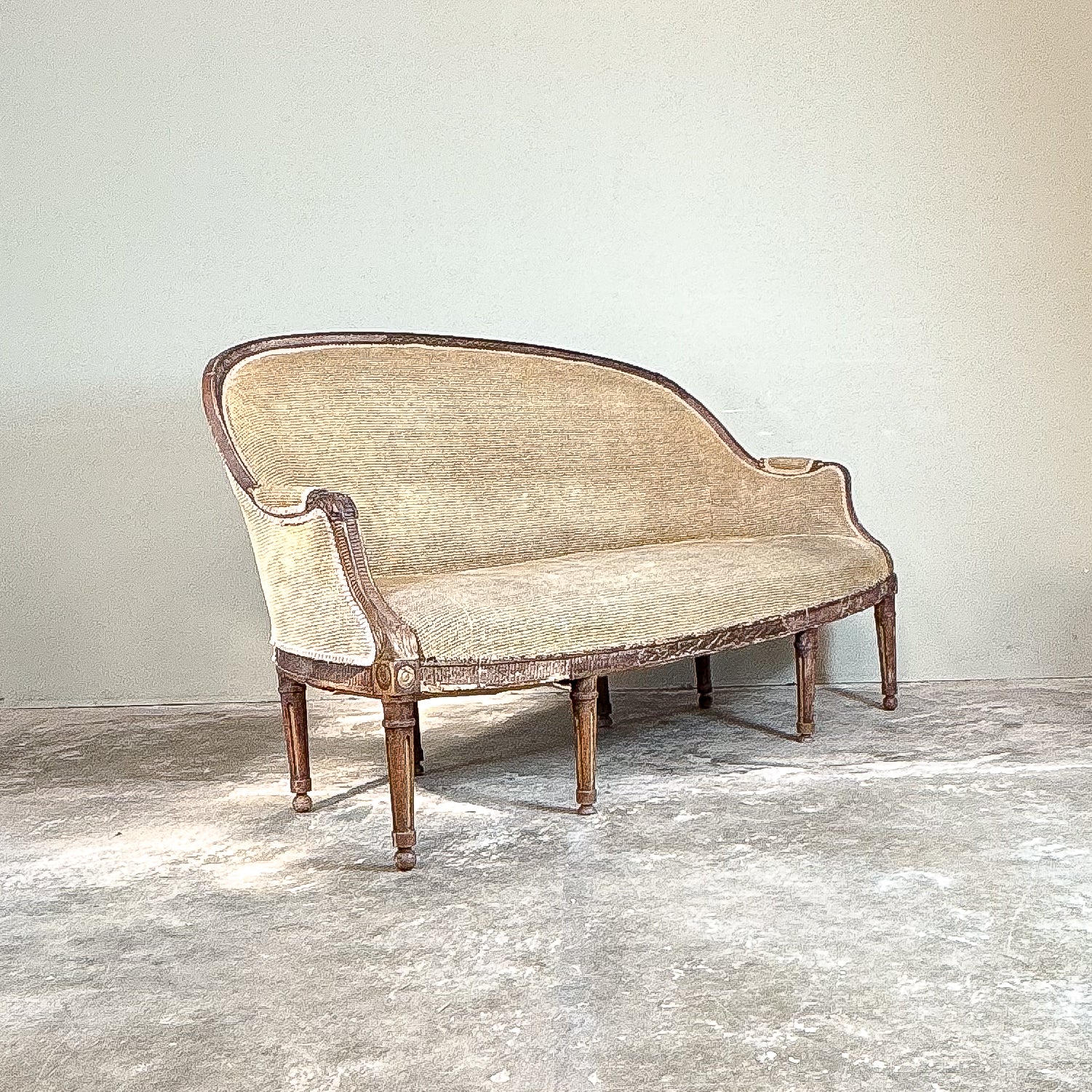 Very pretty mid 19th century French canape, with turned fluted legs and carved decoration to show wood frame. With some original guilt decoration. Circa 1850-60
