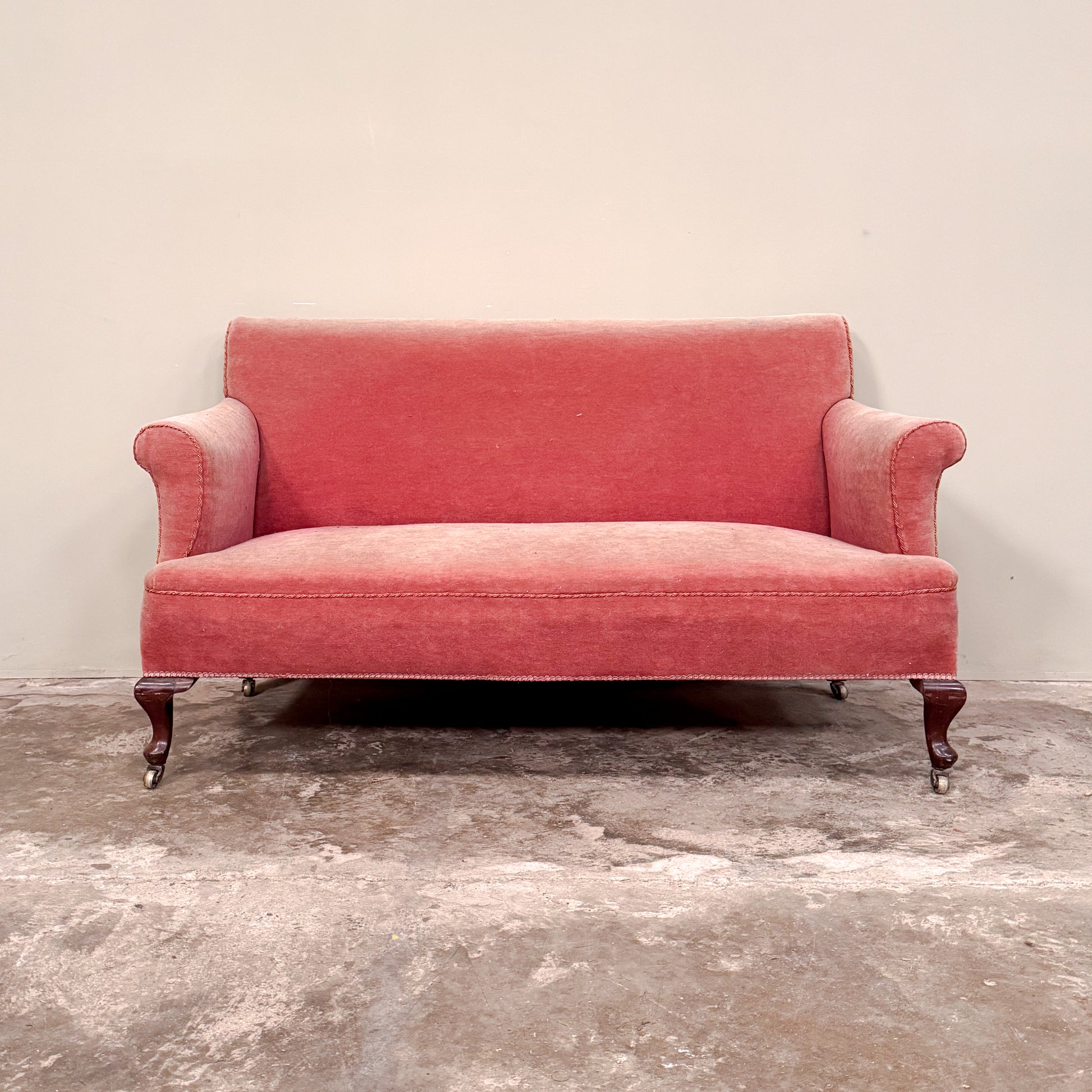 Very pretty, petite two seater English sofa. Standing on walnut cabriole leg sand original brass castors. With scroll arm and sprung back and seat. Circa 1920s