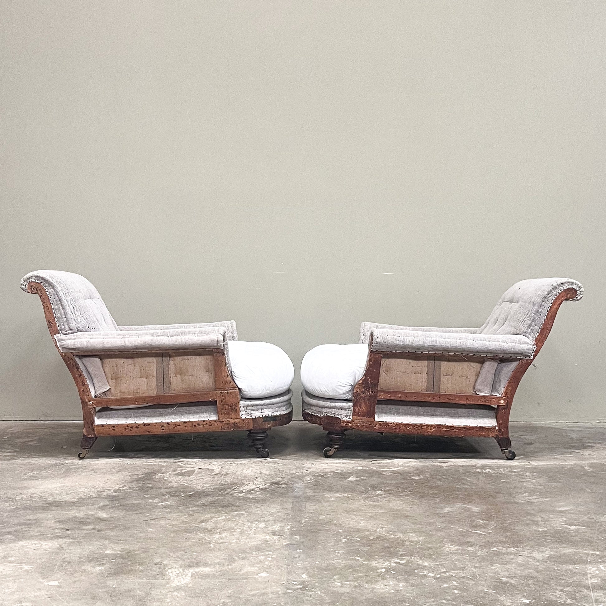 An almost identical pair of matched Howard style very deep seated club chairs. Extremely comfortable, with only 2cms difference in the overall depth. They both have turned front legs, the same height but with very slightly different turning. We have completely rebuilt these from the frame up - using traditional hand tied coil springs, webbing and hessian, with feather and down seat cushion. All they require is a top cover. Circa 1880