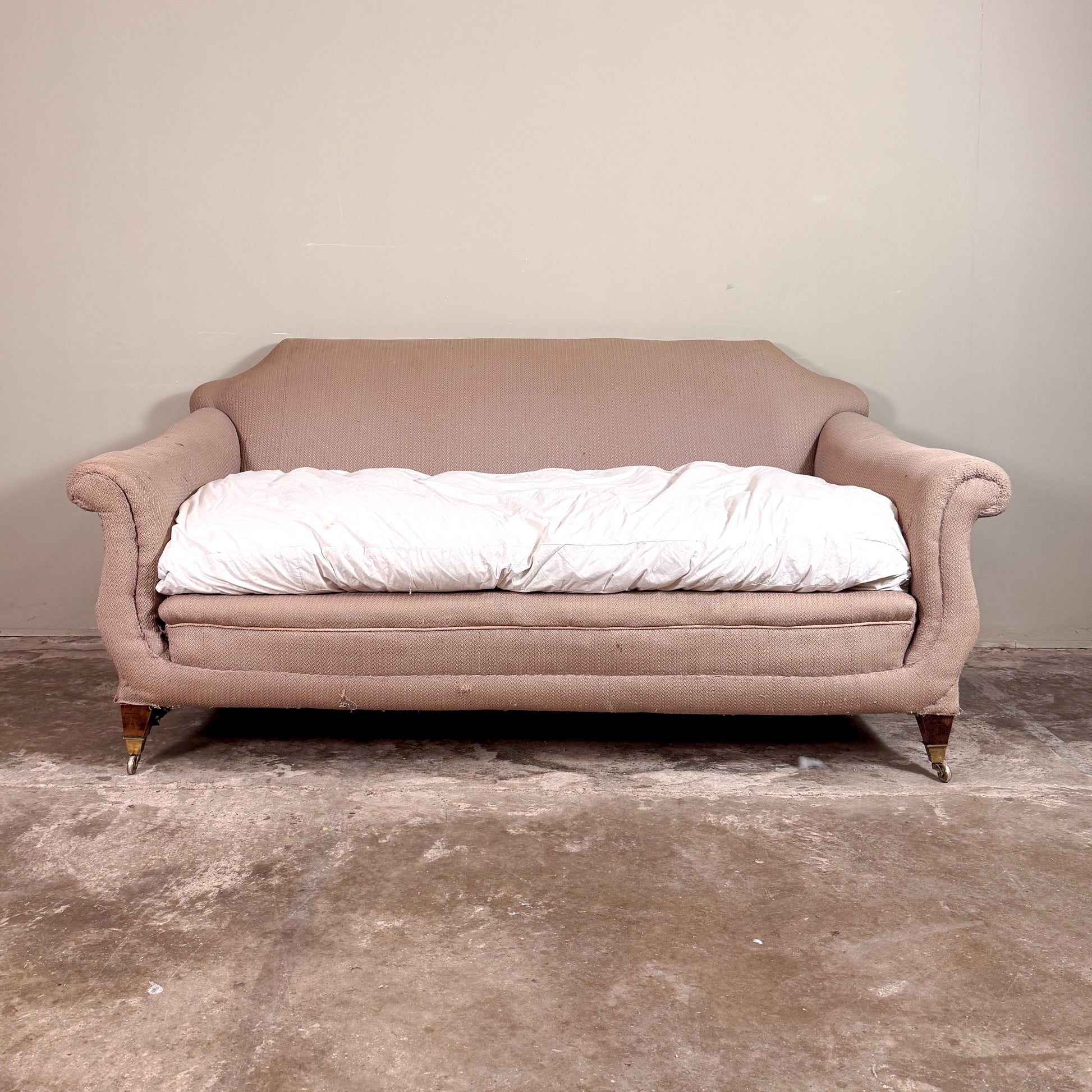 A very deep seated 1930s country house sofa, standing on square taper legs, with sprung back and seat. Feather seat cushions and scroll arms. Circa 1930