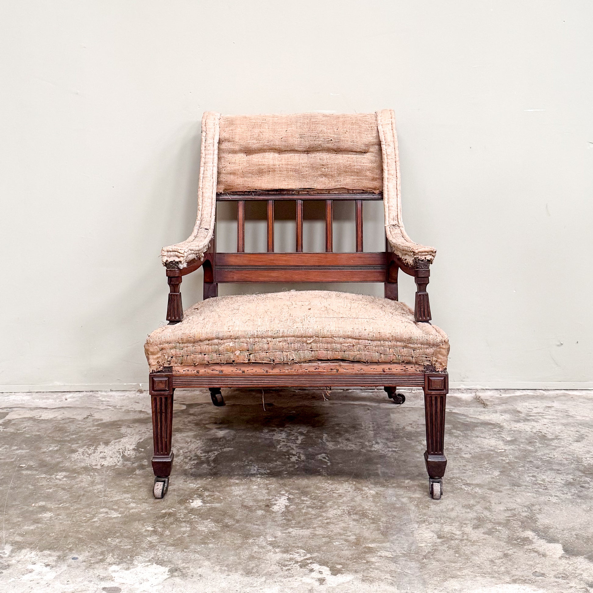 Very good quality Rosewood, open arm library chair. Standing on tapered, fluted, spade legs and original ceramic castors. With sprung seat, scroll back and fluted, tapered arm supports. Circa 1920