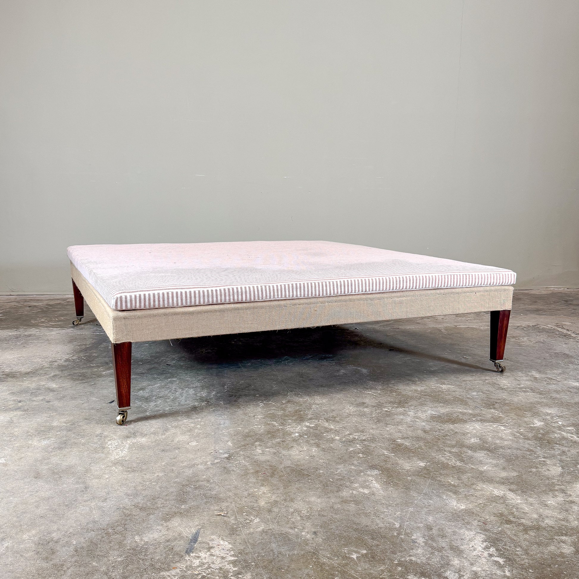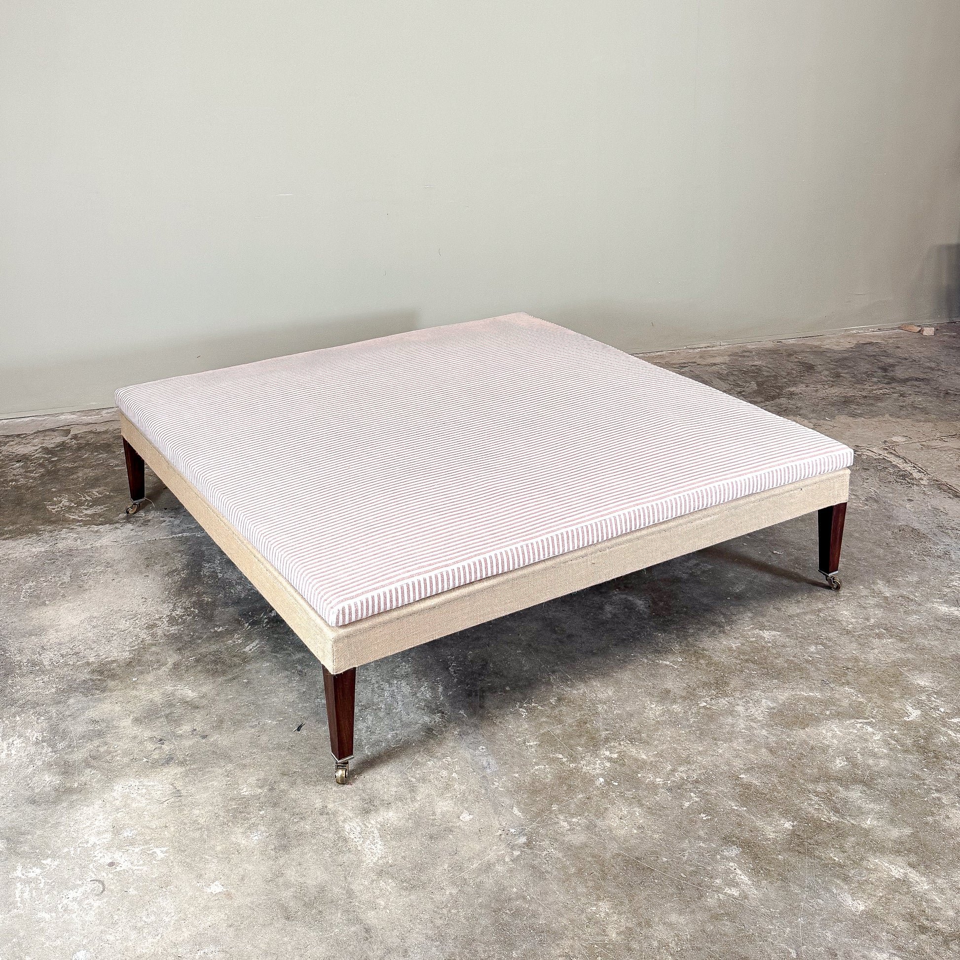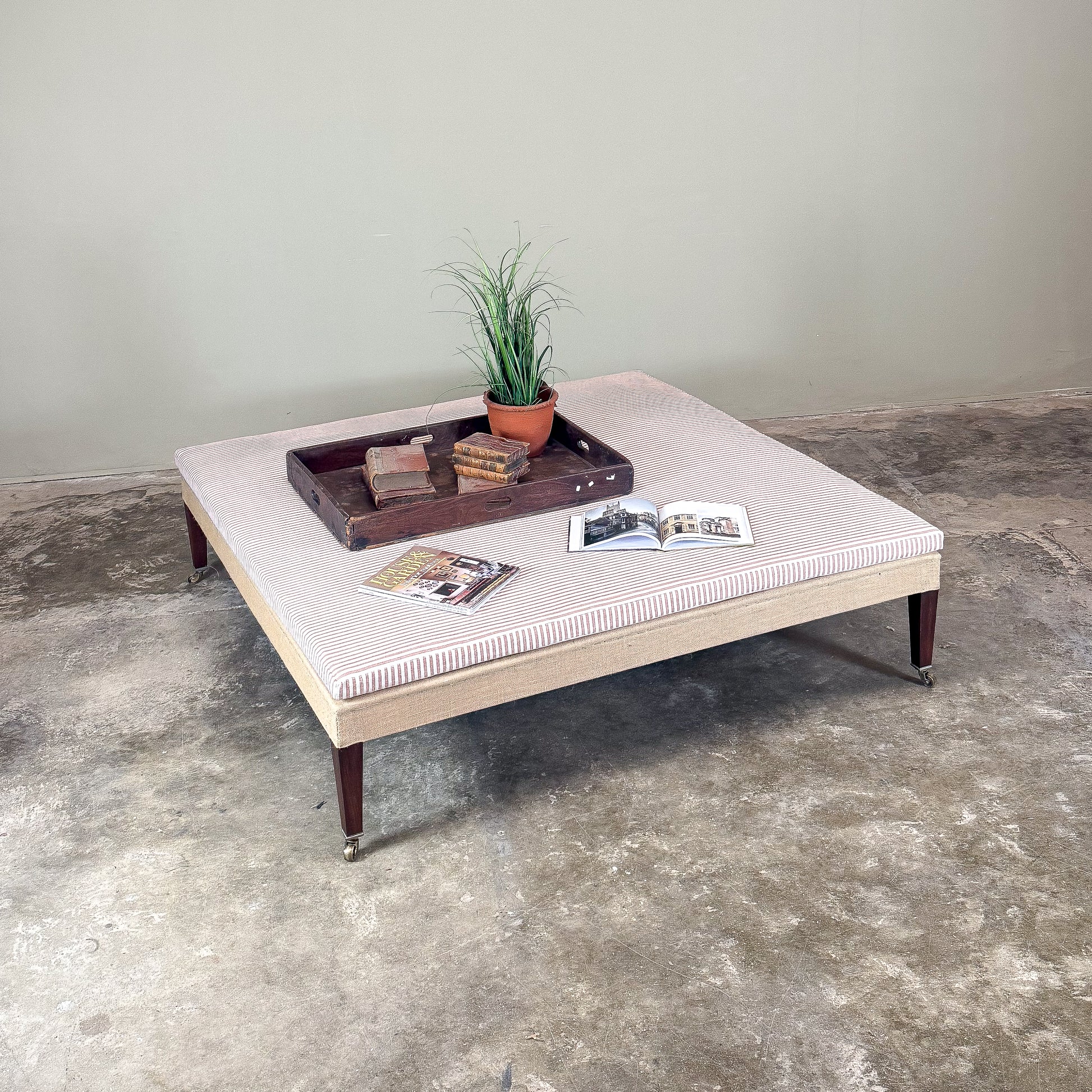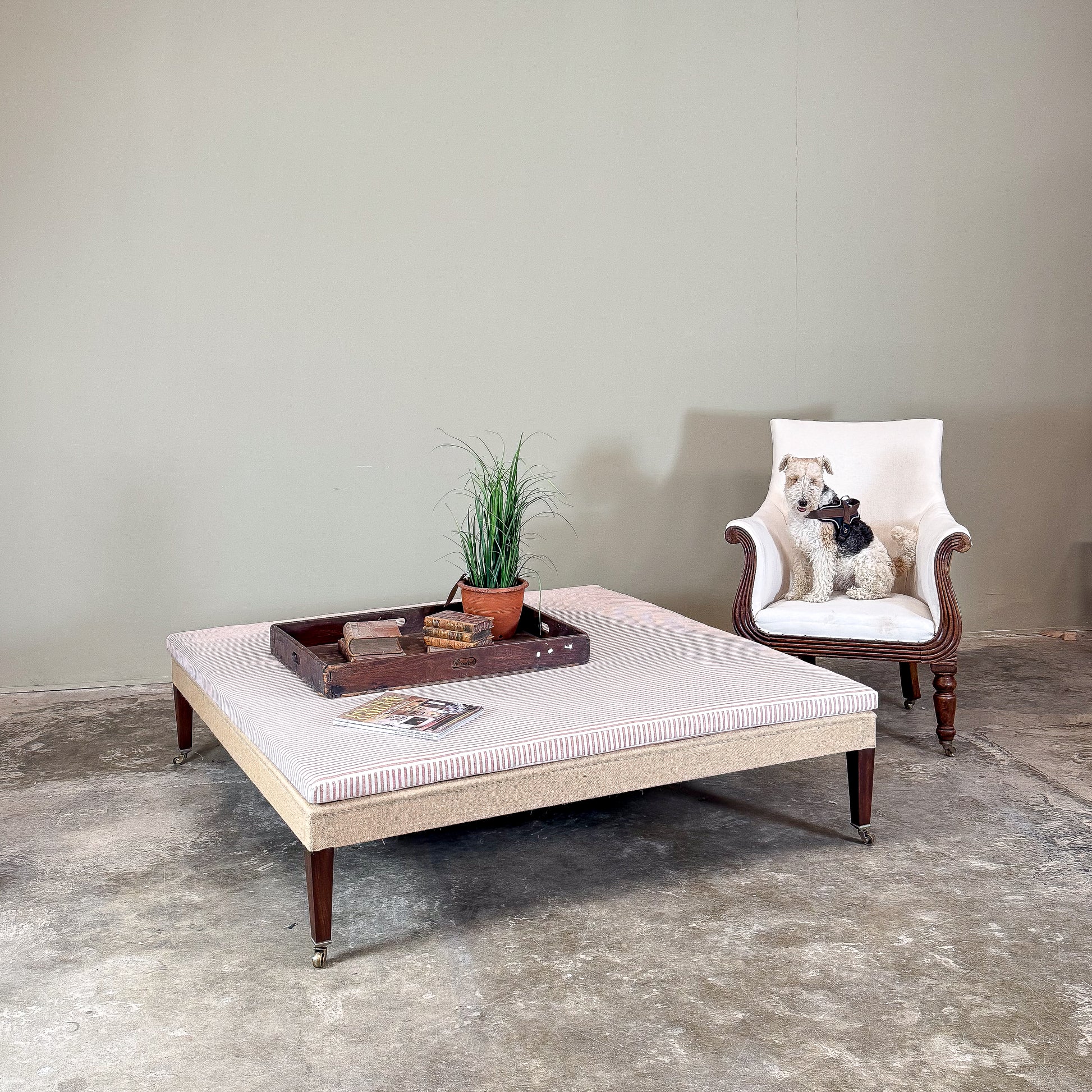 Based on a previously sold, Edwardian footstool, classic simplicity. Standing on square taper mahogany legs and brass castors. Traditionally upholstered with horse hair and hessian, Beautifully finished with hand stitching and tacks. Shown here with or without squab cushion.
