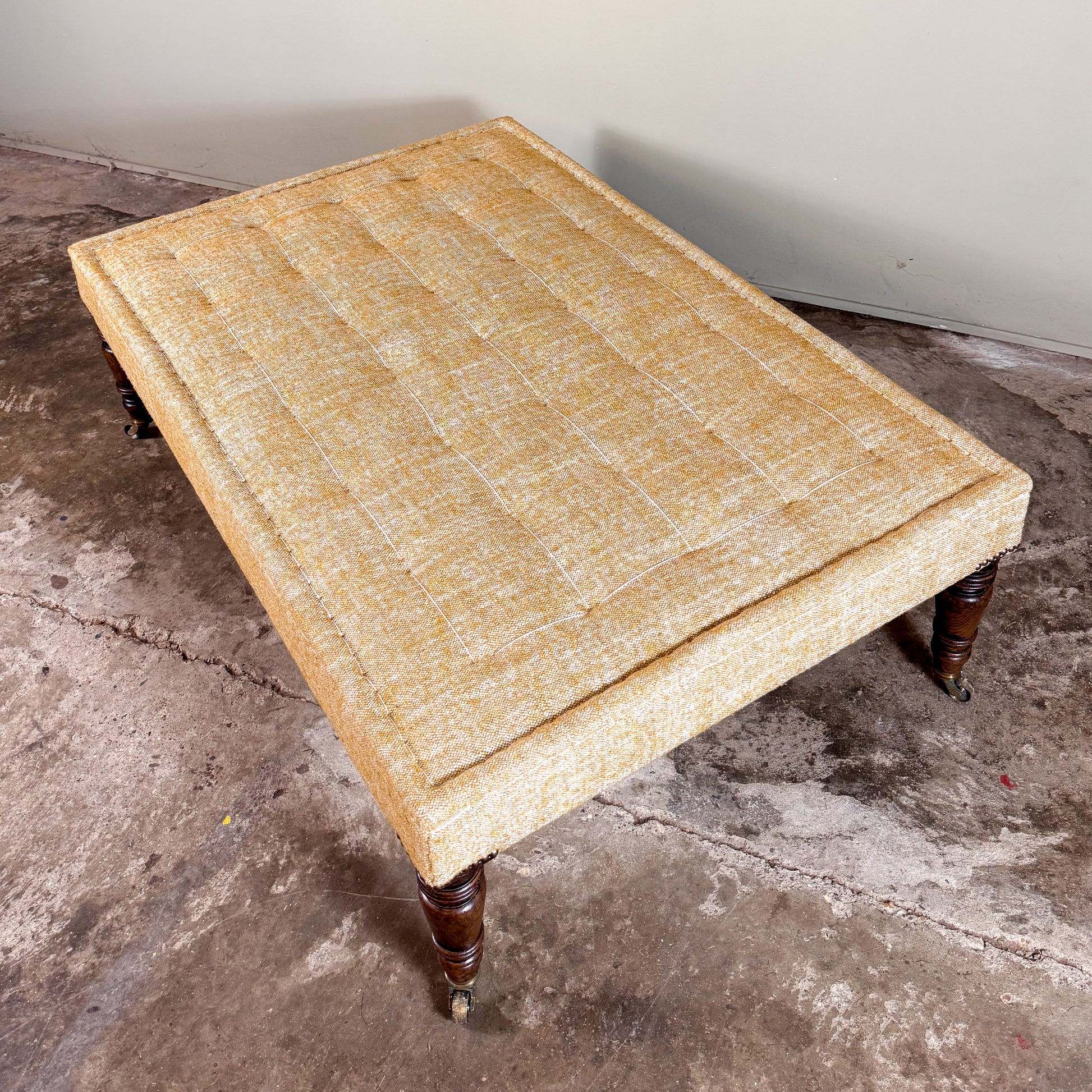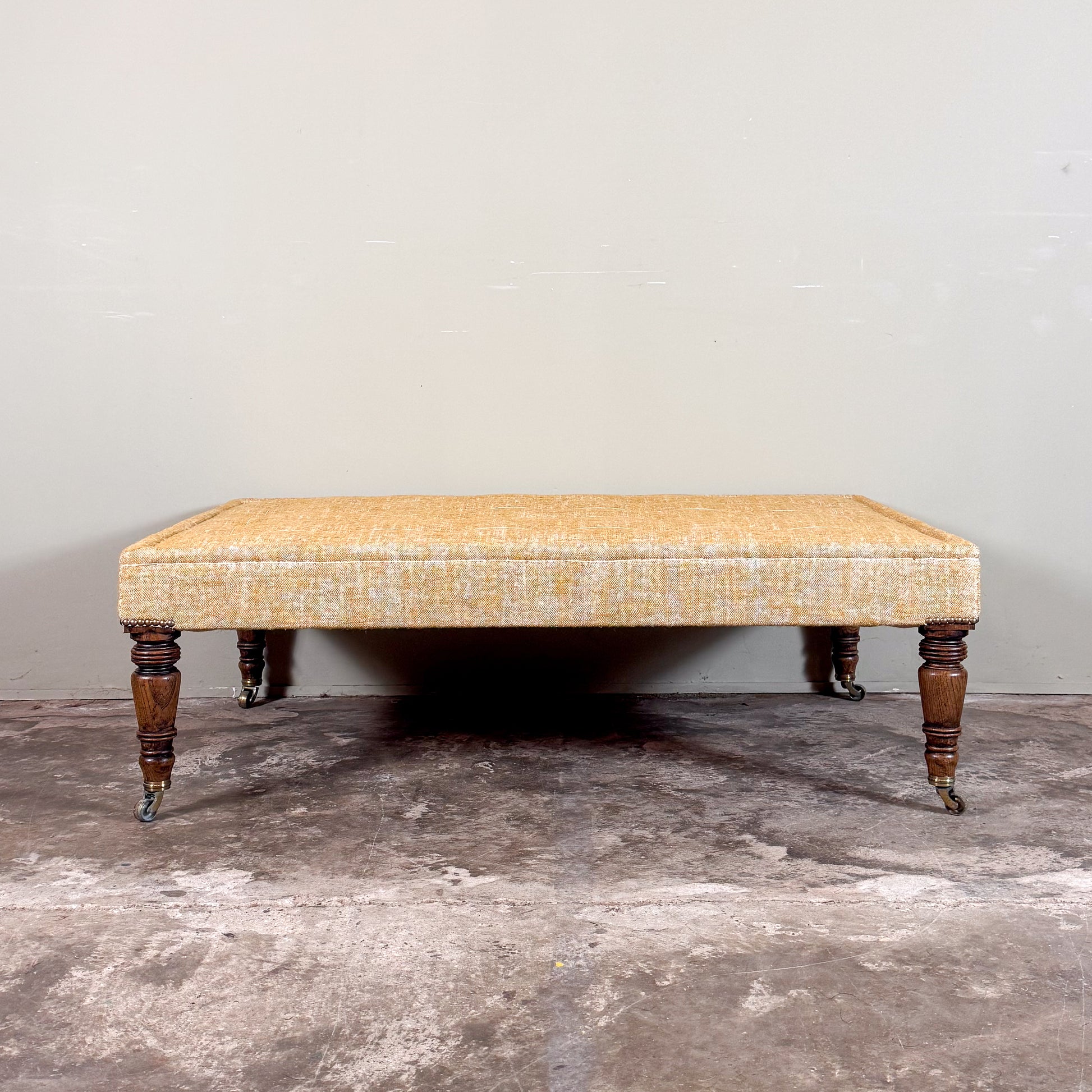 Our best seller, this traditional footstool has a generous turned oak leg, standing on brass castors. The legs can also be a light oak. Traditionally upholstered with horse hair and hessian, and tacked off round the frame.